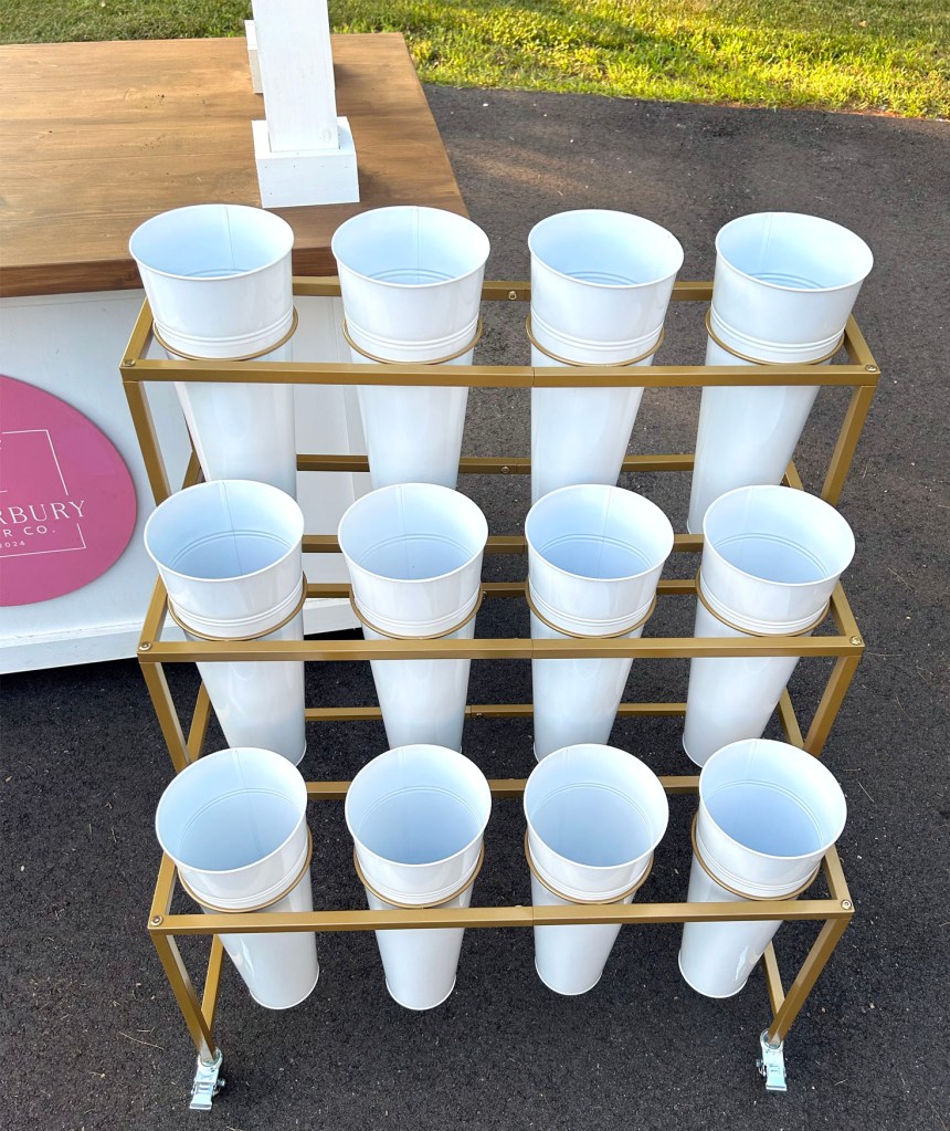 - Beautiful Flower Bar Display (Gold cart with white metal buckets)